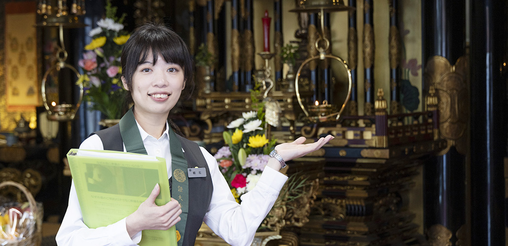 私は働き始めてまだ日が浅いですが、證大寺でしかできない仕事があると実感しています。證大寺の仲間の一員として魅力を広げていき、安心できると思っていただける方を増やす役目を担いたいと思っています。私を信頼していただき、参詣者様から人生における大切な節目のタイミングや、悩みの拠り所として選んでいただける理由の一つになりたいと思っています。