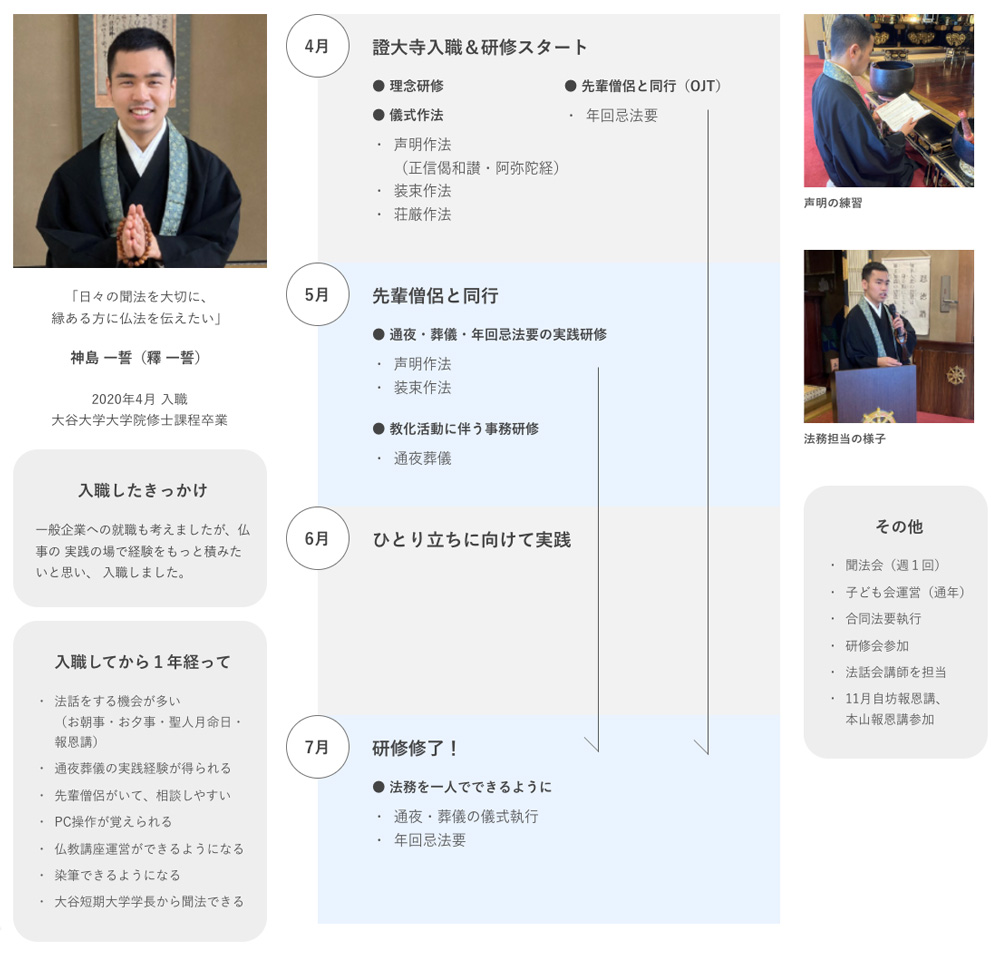私は大谷専修学院で教師資格を取得後、縁あって證大寺の僧侶として働くことになりました。證大寺の研修は実践的な内容はもちろん、勉強できる機会が多いことに驚いています。普通、お寺に入職すると僧侶としての仕事は一般的には葬儀、法要が主となりますが、證大寺では様々な研修や法話会が常に行われているので、僧侶として、人間としての価値観を高め、成長させてくれるのです。お寺自体が僧侶の質を上げる取り組みをしていることに感謝しつつ、日々精進しています。